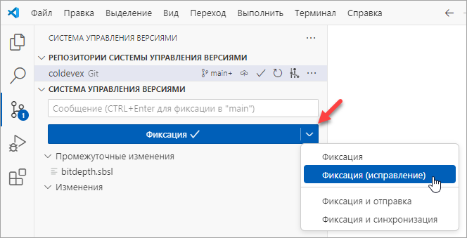 Если вы хотите изменить сам коммит, добавить в него другие измененные файлы, выполните недостающие изменения и добавьте их в индекс. После этого нажмите кнопку Фиксация (Исправление) (Commit (Amend)).