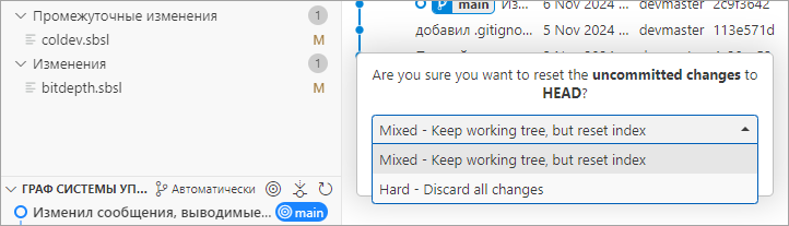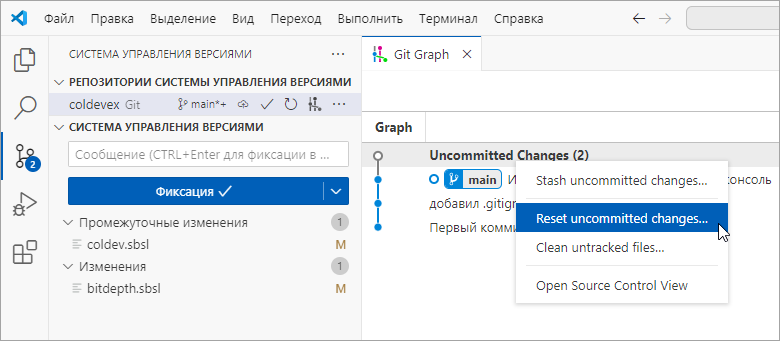 Если вы используете расширение Git Graph, то в нем эти операции выполняются немного иначе. Пока у вас есть измененные файлы, добавлены они в индекс или нет, в списке коммитов Git Graph будет существовать первая строка Uncommitted Changes. В контекстном меню этой строки есть пункт Reset uncommitted changes....
