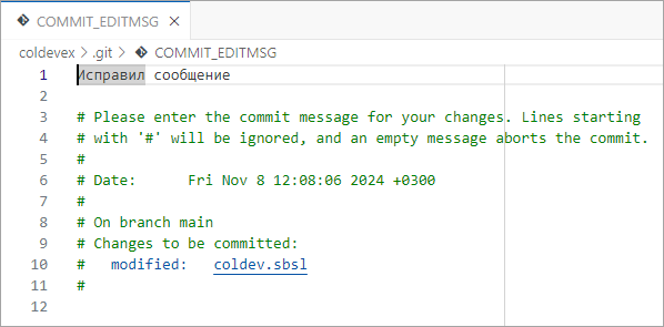 Visual Studio Code откроет редактор коммита, в котором вы можете изменить сообщение. Измените его, сохраните изменения и закройте редактор. Или, если в этом нет необходимости, можете не изменять сообщение, а просто закрыть редактор. После этого Visual Studio Code зафиксирует изменения в репозитории и вместо старого коммита вы увидите новый коммит.