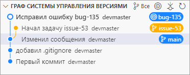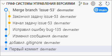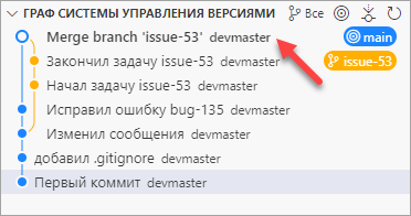 Предположим, вы решили, что работа по задаче №53 закончена, и ее можно влить в ветку main. Для этого, как вы делали это с веткой bug-135 ранее, нужно переключиться на ветку, в которую вы хотите включить изменения (main), и выполнить команду () в дополнительном меню репозитория.