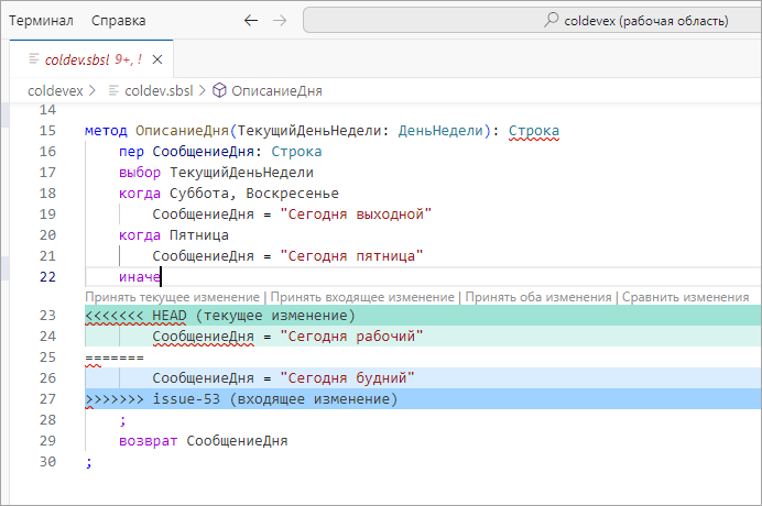 Иногда процесс слияния не проходит гладко. Если вы изменили одну и ту же часть одного и того же файла по-разному в двух объединяемых ветках, Git не сможет их чисто объединить. Если ваше исправление ошибки №53 потребовало изменить, например, ту же часть файла, (тот же реквизит и т.д.) что и bug-135, Visual Studio Code прекратит процесс слияния и сообщит вам о конфликте.