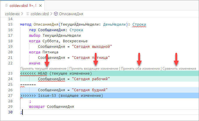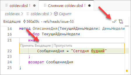 Если этот результат вас не устраивает, вы можете разрешить каждый конфликт в отдельности (принять, например, входящие изменения) или принять все входящие изменения сразу, если знаете, что в ветке issue-53 содержится именно тот вариант файла, который вам нужен.