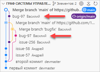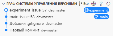 Наконец, вы возвращаетесь в ветку main и делаете пару коммитов main-issue-62 и main-issue-63.