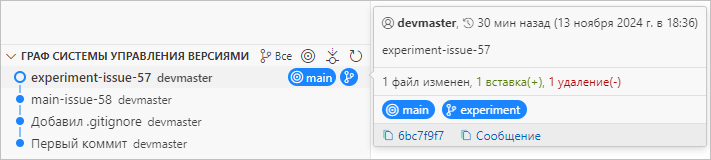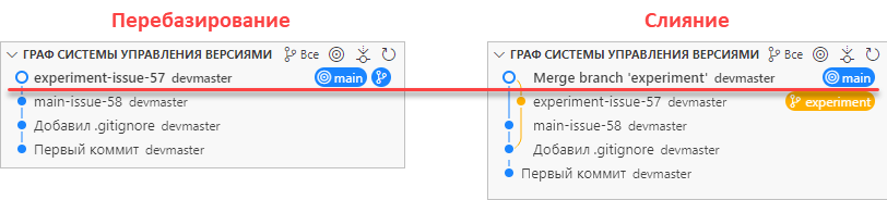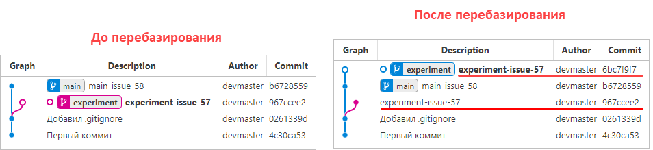Важно заметить, что, в отличие от слияния, при котором оба сливаемых коммита сохраняются, при перебазировании старый коммит experiment-issue-57 удаляется и вместо него создается новый коммит experiment-issue-57 с новым id.
