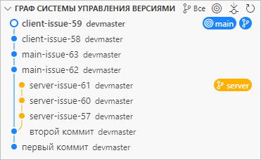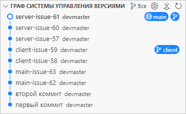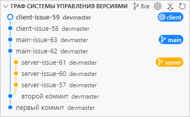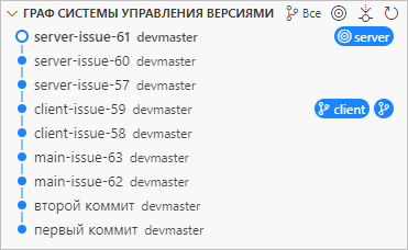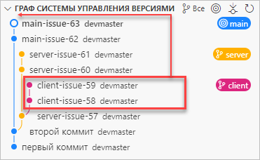 Затем вы ответвляетесь в ветку client, чтобы сделать изменения для клиентской части, и выполняете пару коммитов: client-issue-58 и client-issue-59.