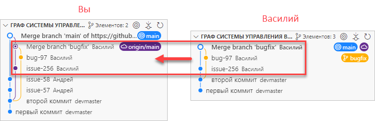 Теперь другой разработчик, Василий, работает с репозиторием, использует слияние, и отправляет результаты своей работы на сервер.