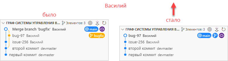 Далее Василий решает вернуться, и вместо слияния ( ()) выполнить перебазирование своей работы ( ()).