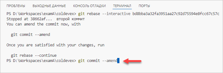 Visual Studio Code начнет перебазирование и остановится на первом коммите из плана перебазирования — второй коммит.