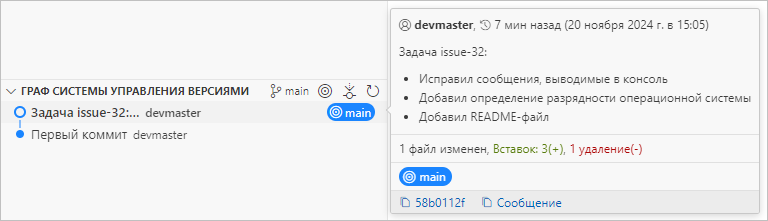 В расширении Git Graph вы включили отображение дополнительных коммитов и видите историю в «честном» виде. В таком виде она удобна, например, для исправления ошибочных действий. Но для обычной работы удобнее видеть только те ветки, которые имеют непосредственное отношение к выполняемой вами задачи. Например, в разделе Граф системы управления версиями (Source Control Graph).
