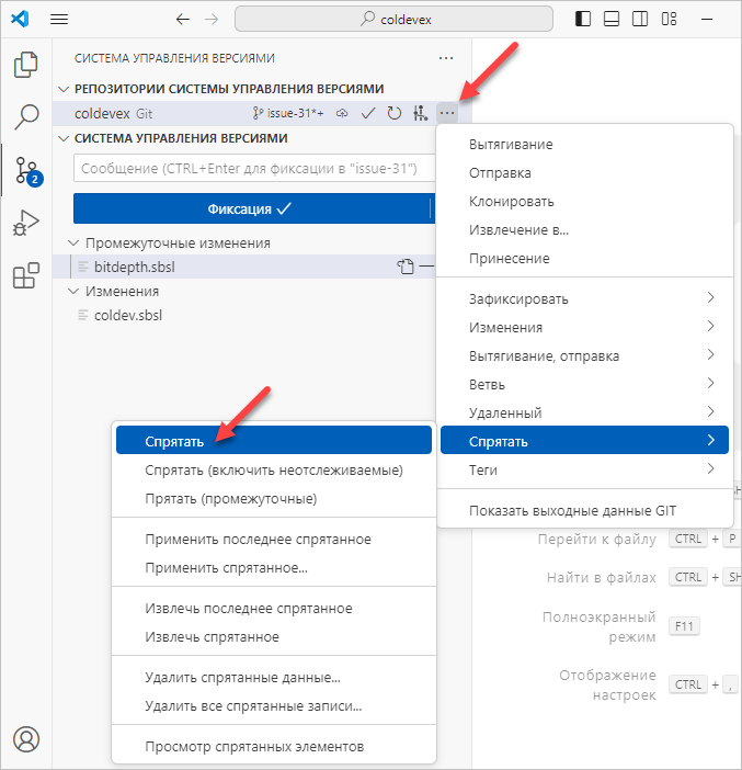 Припрятанных изменений может быть несколько. Чтобы у вас была возможность отличить одни свои изменения от других, задайте понятное вам название для этих изменений, например, «задача 31», и нажмите Ввод.