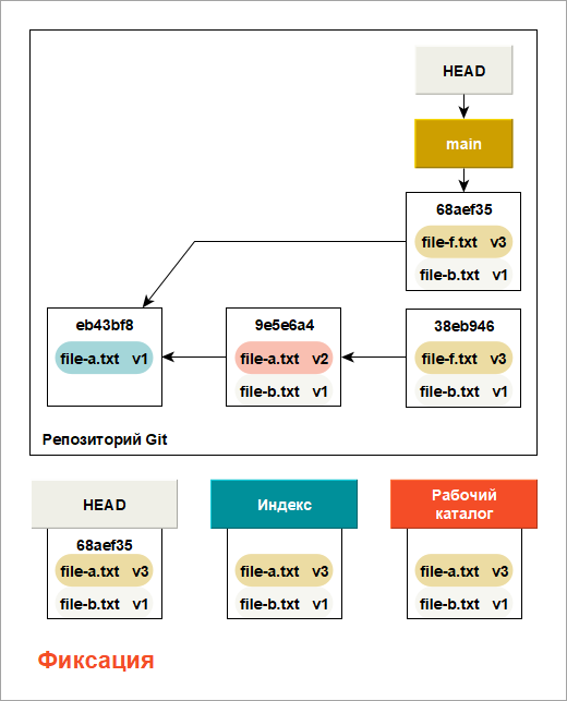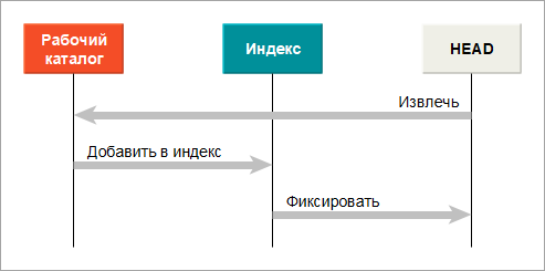 Git заполняет индекс списком изначального содержимого всех файлов, выгруженных в последний раз в ваш рабочий каталог. Затем вы заменяете некоторые из таких файлов их новыми версиями и команда Фиксация (Commit) преобразует изменения в дерево для нового коммита.
