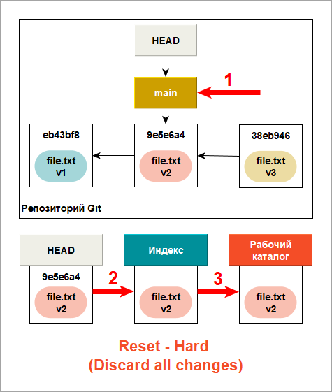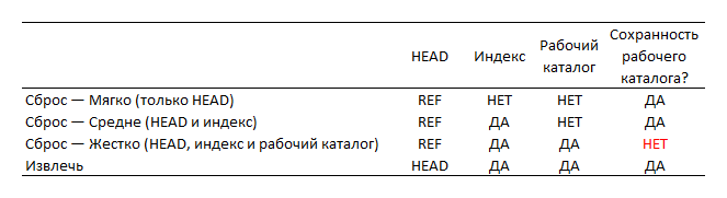 Ниже приведена памятка того, как эти команды воздействуют на каждое из деревьев. В столбце HEAD указывается REF если эта команда перемещает ссылку (ветку), на которую HEAD указывает, и HEAD если перемещается только сам HEAD. Обратите особое внимание на столбец Сохранность рабочего каталога?. Если в нем указано НЕТ, то хорошенько подумайте прежде чем выполнить эту команду.