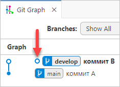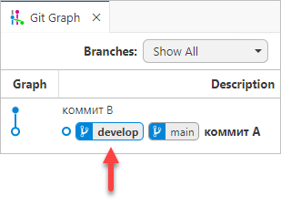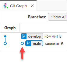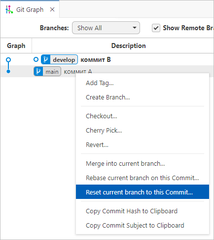 Если вы выполните Reset current branch to this Commit... на ветке main, сама ветка develop станет ссылаться на тот же коммит, что и main.