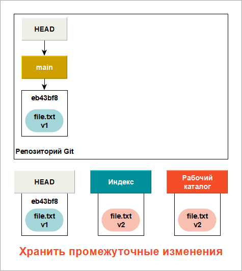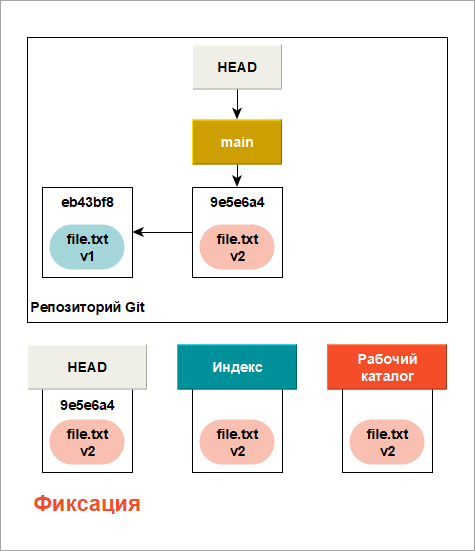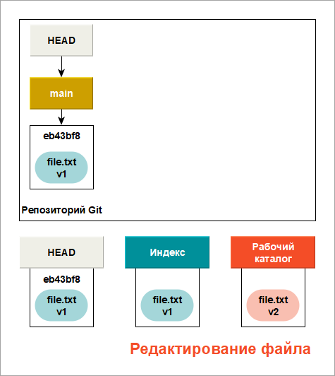 Теперь вы хотите внести изменения в файл и зафиксировать его. Вы пройдете через все ту же процедуру. Сначала вы отредактируете файл в нашем рабочем каталоге. Эта версия файла обозначается v2 и изображается красным цветом.
