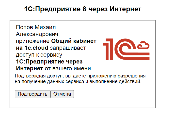 redirect_uri | Строка | Адрес, на который будет переадресован пользователь после прохождения авторизации. Должен совпадать с redirect_uri, указанным на этапе добавления стороннего приложения. | https://1c.cloud/callback |