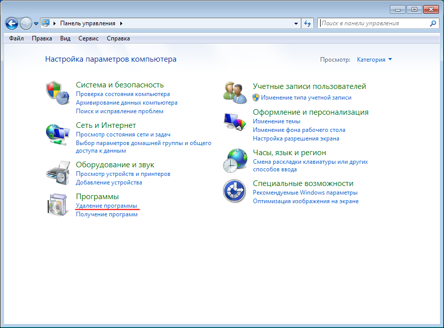 , выберите пункт Панель управления. После этого выберите пункт Удаление программы.