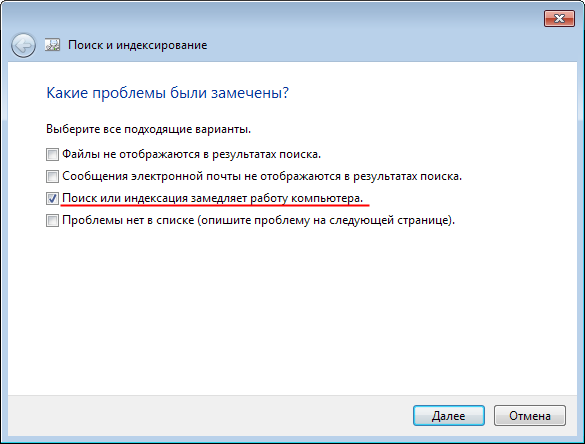 - В появившемся окне «Поиск и индексирование» отметьте галочкой пункт Поиск или индексация замедляет работу компьютера. Нажмите Далее.
