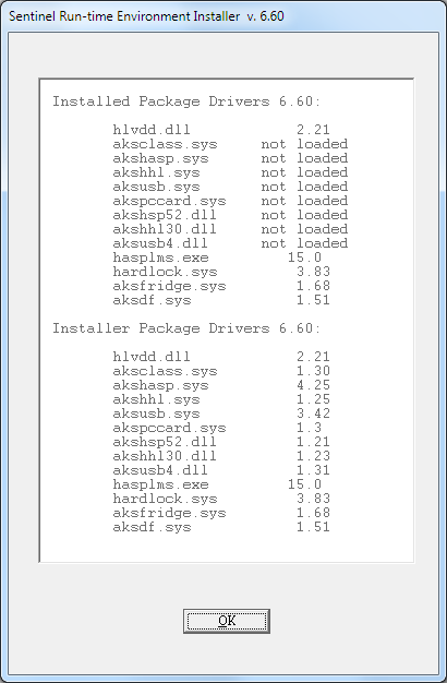 После запуска команды в первых строках выводится информация о версии установленного драйвера и его компонентов. Ниже на экране отображаются данные для драйвера, входящего в дистрибутив внутри файла haspdinst.exe.