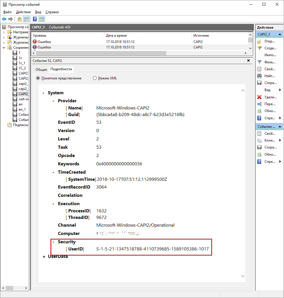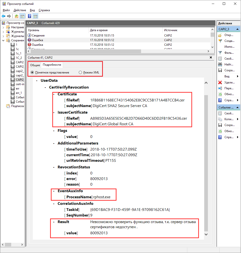 Для точной диагностики проблемы следует посмотреть записи в журнале CAPI2 операционной системы Windows.