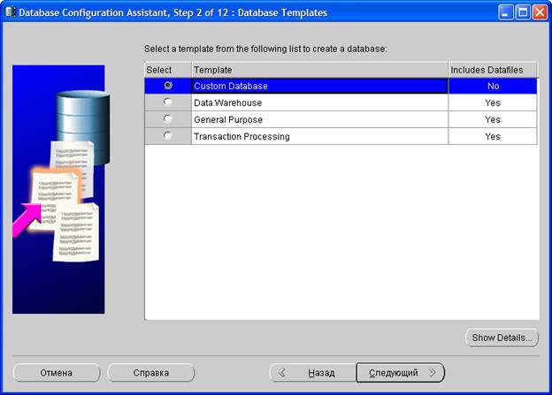 На втором шаге в списке шаблонов для создания базы данных выберите Custom Database. Нажмите Следующий >.