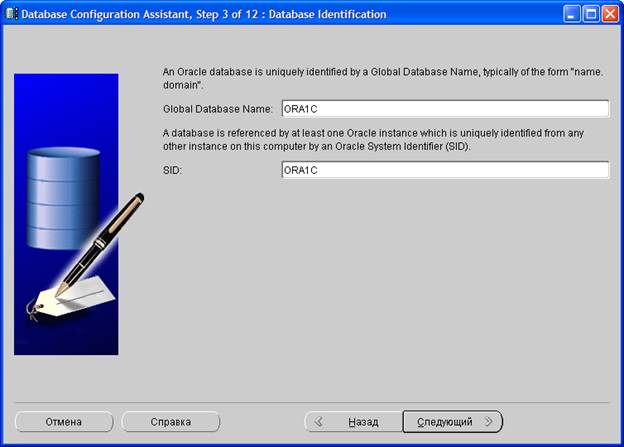На третьем шаге в поле Global Database Name задайте имя базы данных Oracle, например ORA1C. Нажмите Следующий >.