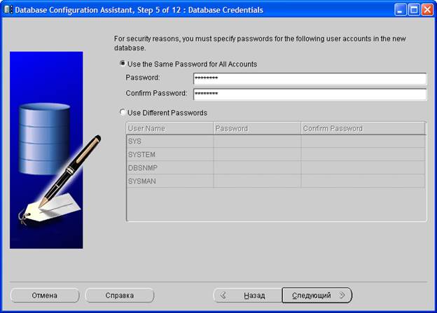 Из соображений безопасности в поле Password задайте пароль для специальных пользователей базы данных Oracle.