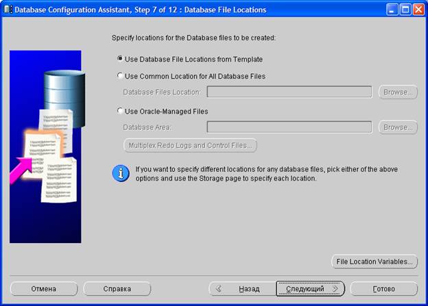 На одиннадцатом шаге можно скорректировать расположение файлов базы данных Oracle, задать размер логов REDO, а также создать табличные пространства. Создавать табличные пространства для платформы "1С:Предприятие 8.2" нет необходимости, т. к. платформа создаст их автоматически при создании первой информационной базы.