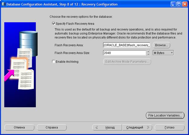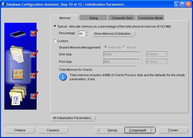 На десятом шаге задаются параметры базы данных Oracle. Объем памяти, доступной для данной базы данных Oracle, можно задать как в процентах от общей физической памяти сервера, так и более детально (выбрав пункт Custom и установив параметры SGA Size и PGA Size).