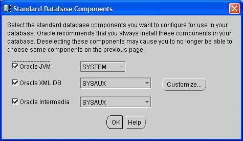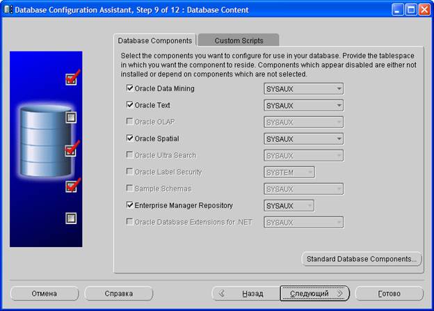 На девятом шаге требуется выбрать компоненты, которые будут использованы в базе данных. Нажмите кнопку Standard Database Components. Отобразится следующий диалог: