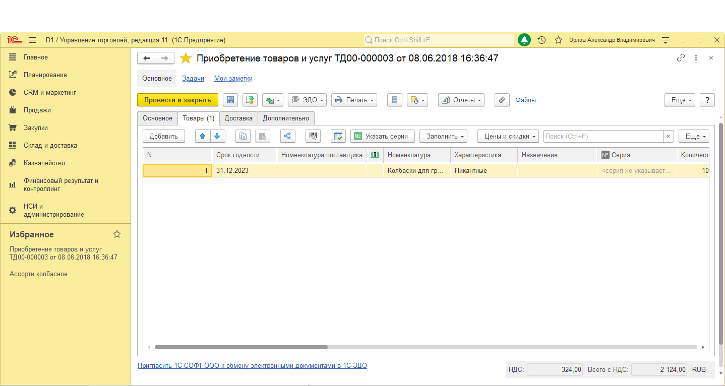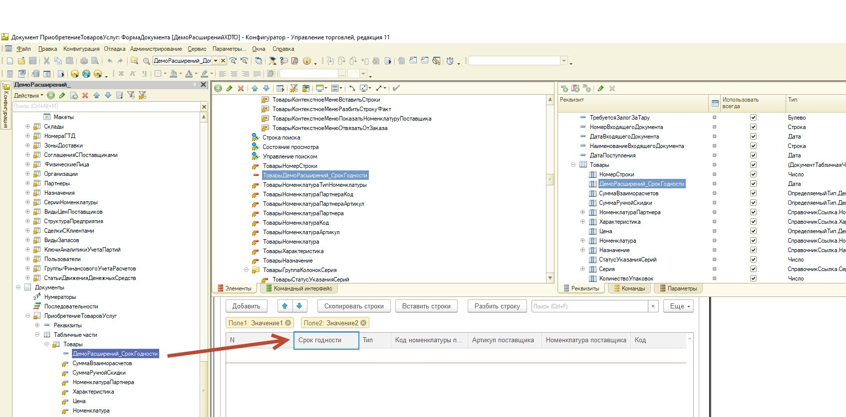 Для решения задачи нам нужно добавить поле СрокГодности в табличную часть Товары, вывести новое поле в форму.