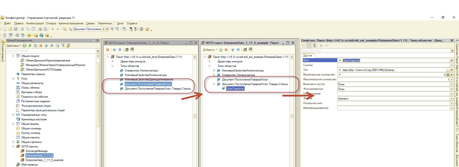 Продемонстрировать расширение состава свойств формата EnterpriseData для табличных частей. Для этого, на основе вышеописанного сценария, поправить выгрузку табличной части Товары документа Приобретение товаров услуг. Предположим, что у нас есть новое поле СрокГодности (тип Дата), которое надо выгружать с таблицей Товары.