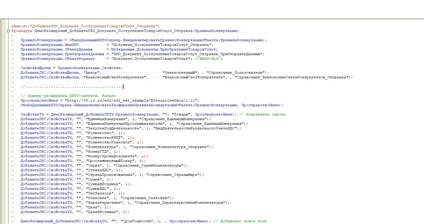 Далее нам необходимо добавить в процедуру выборки данных новое поле. Для этого нужно изменить алгоритм ПТиУ_РасширенныеДанныеИБ(), который вызывается при работе обработчика ПриОтправкеДанных выгрузки документа. Поскольку алгоритм большой, то в статье демонстрируется только одна из правок.