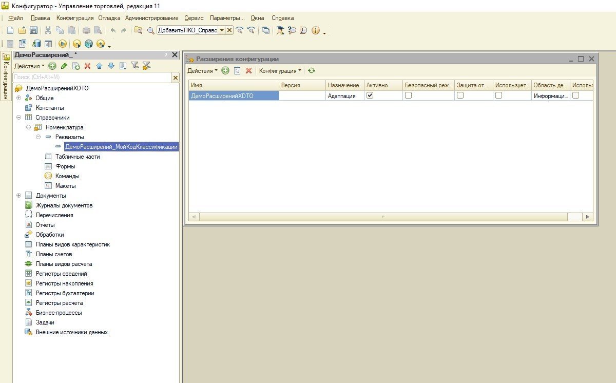 Сначала добавим расширение конфигурации, и в расширении конфигурации добавим новые реквизит МойКодКлассификации справочника Номенклатура.