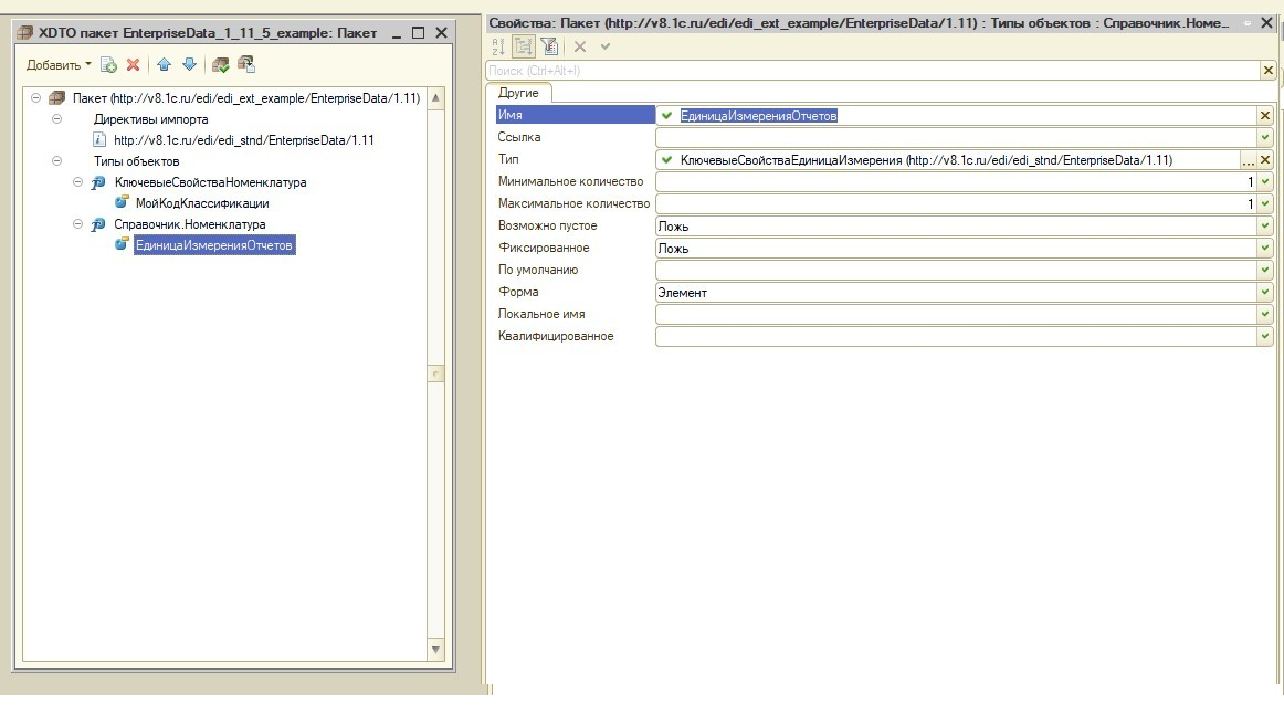 Необходимо обратить внимание на директиву импорта, т.к. это ключевой момент. Обязательно нужно указать, что наш пакет-XDTO унаследован от типового. Это необходимо для того, чтобы сослаться на базовые объекты формата и, в дальнейшем, оперировать их свойствами. Поскольку пакет EnterpriseData_1_11_5 базируется на ExchangeMessage, так же необходимо забрать и его в расширение, иначе анализатор платформы выдаст ошибку проверки пакета. При этом XDTO-пакет EnterpriseData_1_11_5 нужно забрать со следующими объектами: