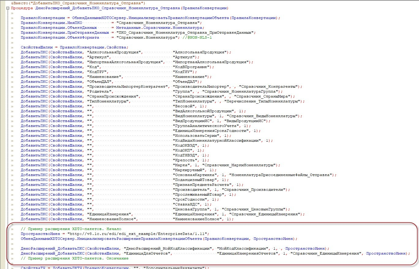 При работе с расширениями рекомендуется делать одно расширение и для источника, и приемника, т.к. для системы важно обладать идентичным составом свойств, у которых обязательно должно совпадать пространство имен (URI). Порядок добавленных свойств тоже должен быть одинаков в двух информационных базах, иначе будет ошибка чтения файла. Обновление таких расширений можно делать через сравнение/объединение, или автоматизировать процесс установки/обновления расширений в нескольких ИБ при помощи пакетного режима работы 1С: Предприятия. Далее приступаем к загрузке. Начинаем с добавления нашего расширение в приемник. Поскольку в расширении уже есть изменения, которые инициализируют XDTO-пакет в общем модуле ОбменДаннымиПереопределяемый, мы начнем работу с правки ПКО загрузки справочника Номенклатура. Для этого переходим в метод ДобавитьПКО_Справочник_Номенклатура_Получение менеджера конвертации и добавим описание новых свойств.