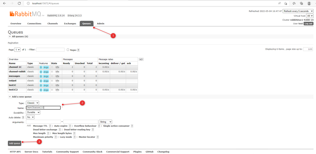 - Заполните поле Name, введя название очереди TestChannel1C, и нажмите Add queue.