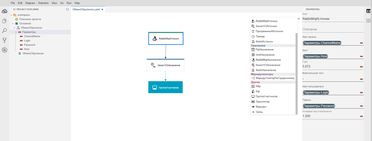 Далее необходимо заполнить параметры у узла RabbitMqИсточник, которые позволят взаимодействовать "1С:Шине" с брокером RabbitMQ.