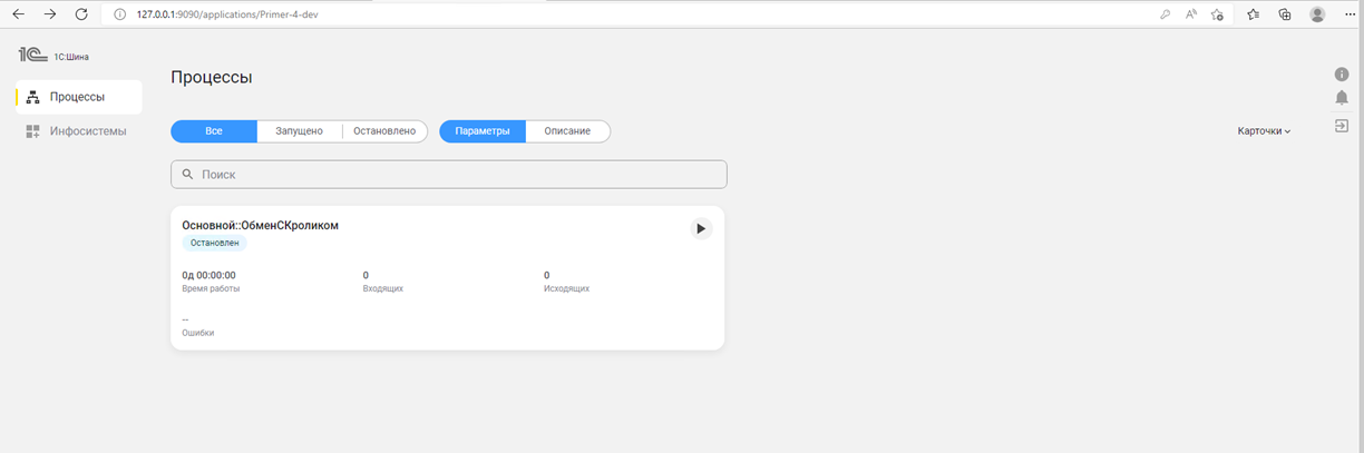 - Проверьте, что в панели управления "1С:Шины" увеличилось количество входящих и исходящих сообщений.