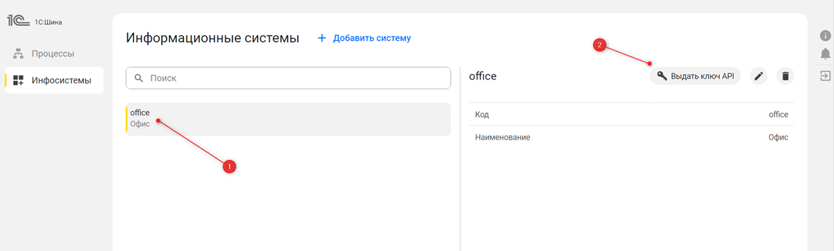 - Теперь для информационной системы нужно получить ключ, который она будет использовать при подключении к серверу 1С:Шины.