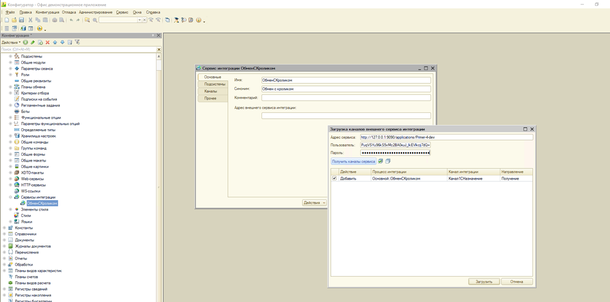 В информационной базе Офис вы создадите объект конфигурации Сервис интеграции, взаимодействующий с севером "1С:Шины". Под управлением этого сервиса интеграции будет работать один канал. По каналу ОбменСКроликом сообщения от RabbitMQ будут поступать в базу Офис.