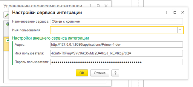 - Добавьте сервис интеграции с именем ОбменСКроликом.