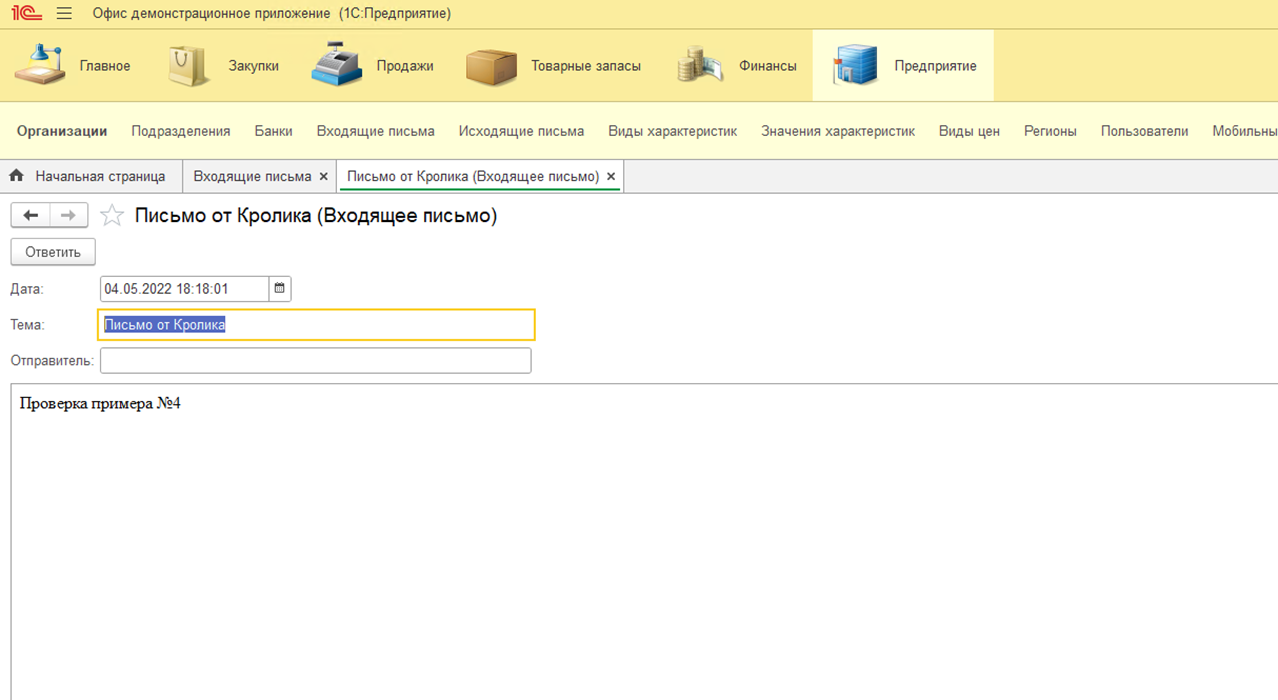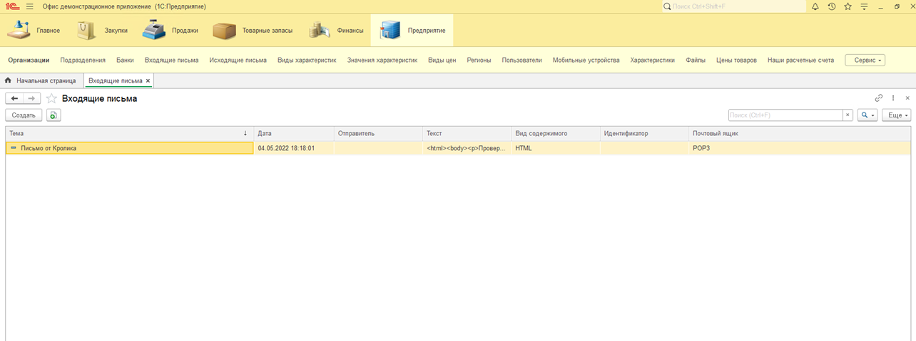 - Откройте базу Офис и перейдите Предприятие – Входящие письма и увидите сообщение от RabbitMQ