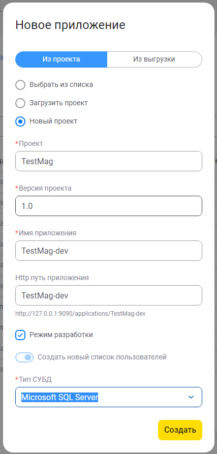 Указать режим разработки и выбрать тип СУБД (в нашем примере это будет Microsoft SQL Server) и нажать кнопку "Создать". Пример настройки приложения:
