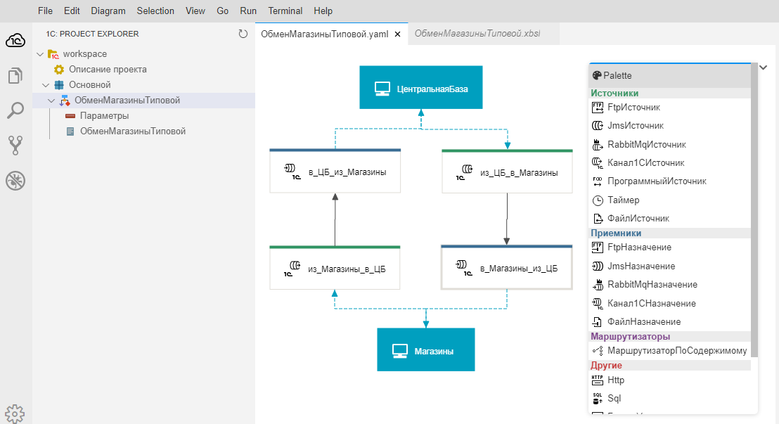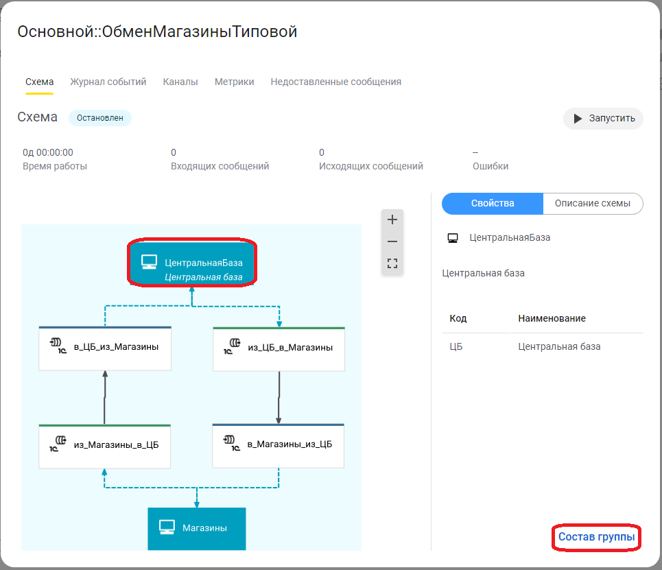 Сообщения поступают в шину через узлы вида "Канал1СИсточник" (узлы "из_Магазины_в_ЦБ" и "из_ЦБ_в_Магазины") и доставляются в узлы вида "Канал1СНазначение" (узлы "в_ЦБ из_Магазины" и "в_Магазины_из_ЦБ").
