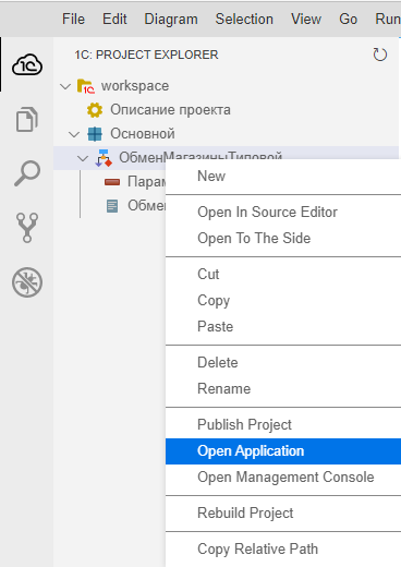 Для создания проекта нужно открыть панель управление сервером "1С:Шины", выбрать пункт меню "Приложения", далее "+ Новое приложение":