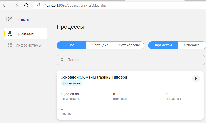 После успешной авторизации откроется вкладка приложения "1С:Шины", на ней будет отображен список процессов интеграции, существующих в приложении. В тестовом примере будет единственный процесс интеграции "Основной::ОбменМагазиныТиповой":