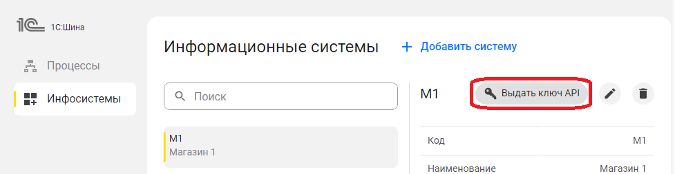 После добавления информационных систем необходимо получить ключ, который они будут использовать при подключении к серверу "1С:Шины". Чтобы получить ключ, нужно выбрать информационную систему, а затем нажать кнопку "Выдать ключ API":