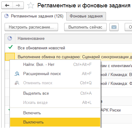 Перед выполнением настроек на стороне информационных баз необходимо отключить регламентные задания существующего обмена, чтобы в ходе запуска обмена через "1С:Шину" не возникло коллизий, когда сформированное сообщение для обмена будет отправлено и через "1С:Шину", и через настроенный транспорт существующего обмена.