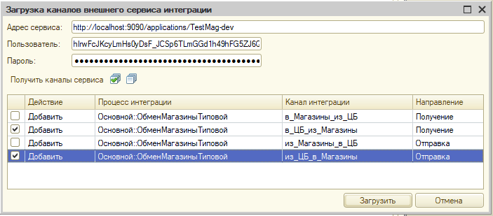 В списке необходимо установить отметки только для тех каналов, которые относятся к узлу "ЦентральнаяБаза". Далее нажать на кнопку "Загрузить" и перейти на вкладку "Каналы" – в список должны добавиться те каналы, которые были выбраны: