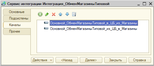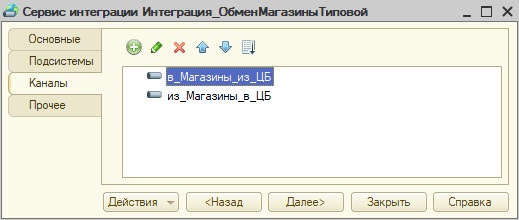 Информационные системы – участники процесса интеграции (в роли которых выступают информационные базы "1С:Предприятия") объединяются в группы участников (в нашем примере –"Магазины" и "ЦентральнаяБаза"), которые, в свою очередь, связываются с каналами. Отправлять сообщения в каналы вида "Канал1СИсточник" и получать сообщения из каналов вида "Канал1СНазначение" будут только те информационные системы, которые включены в группы участников, связанные с соответствующим каналом.